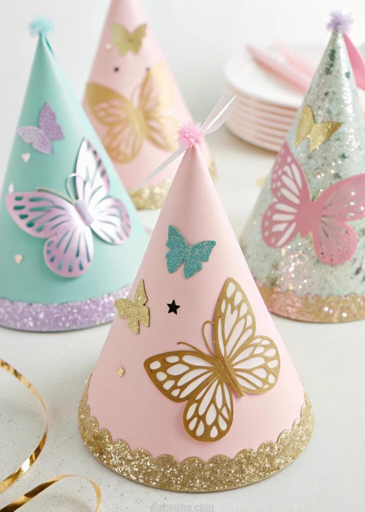 Provide butterfly-themed party hats for guests to wear during the event. Use pastel colors and attach small butterfly cutouts or glitter accents.