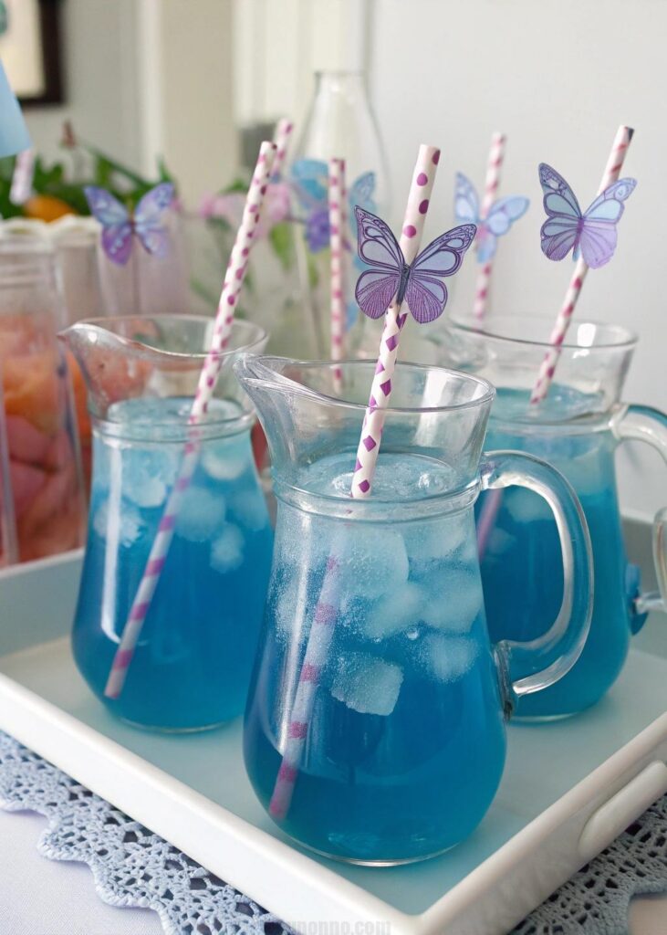 Set up a drink station with butterfly-themed beverages. Serve butterfly pea flower tea, which changes color with citrus, or create butterfly-shaped ice cubes.