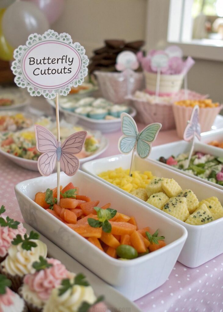 Label your food with butterfly-themed tags for a cohesive look. Use pastel colors and add small butterfly cutouts or drawings.