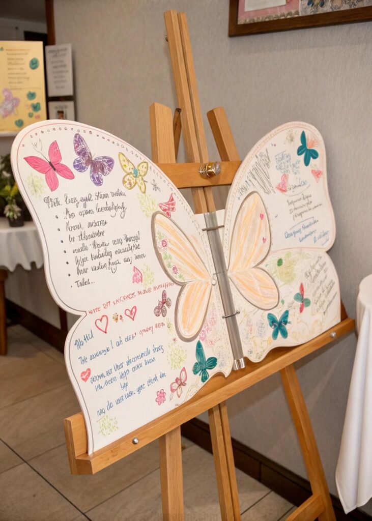 Create a unique guest book using a butterfly theme. Provide a blank canvas or a large butterfly cutout for guests to write their wishes and messages. Use colorful markers or paint pens for a vibrant look.