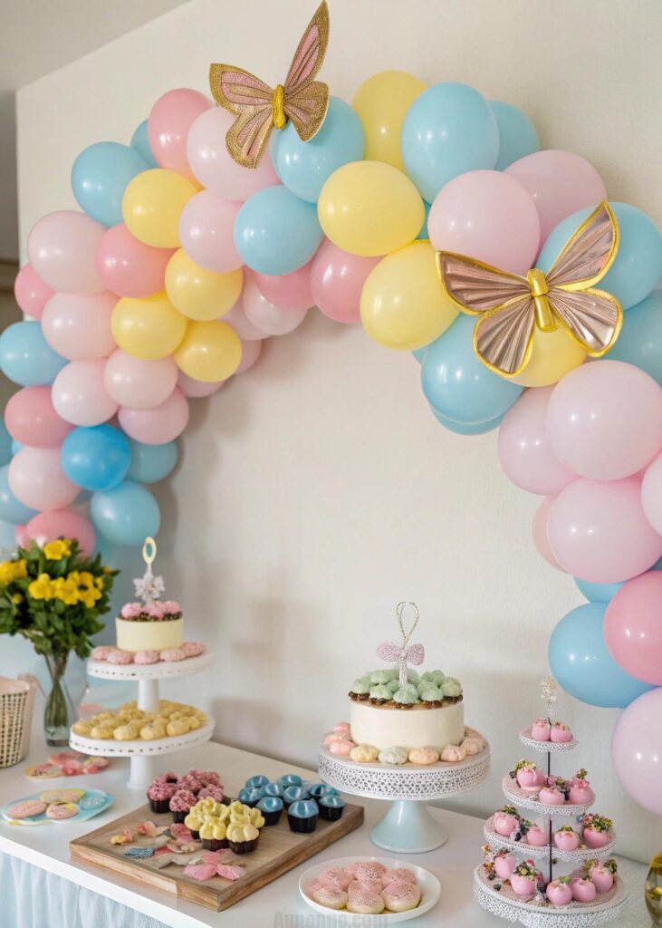 Add a touch of whimsy with a butterfly balloon garland. Use pastel-colored balloons and intersperse them with butterfly-shaped foil balloons. Hang the garland above the dessert table or entrance for a festive look.