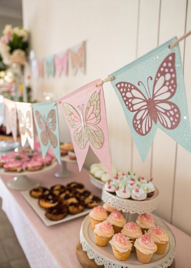 Order or bake a butterfly-themed cake to serve as the centerpiece of your dessert table. Choose a design with edible butterflies, floral accents, and soft pastel colors.