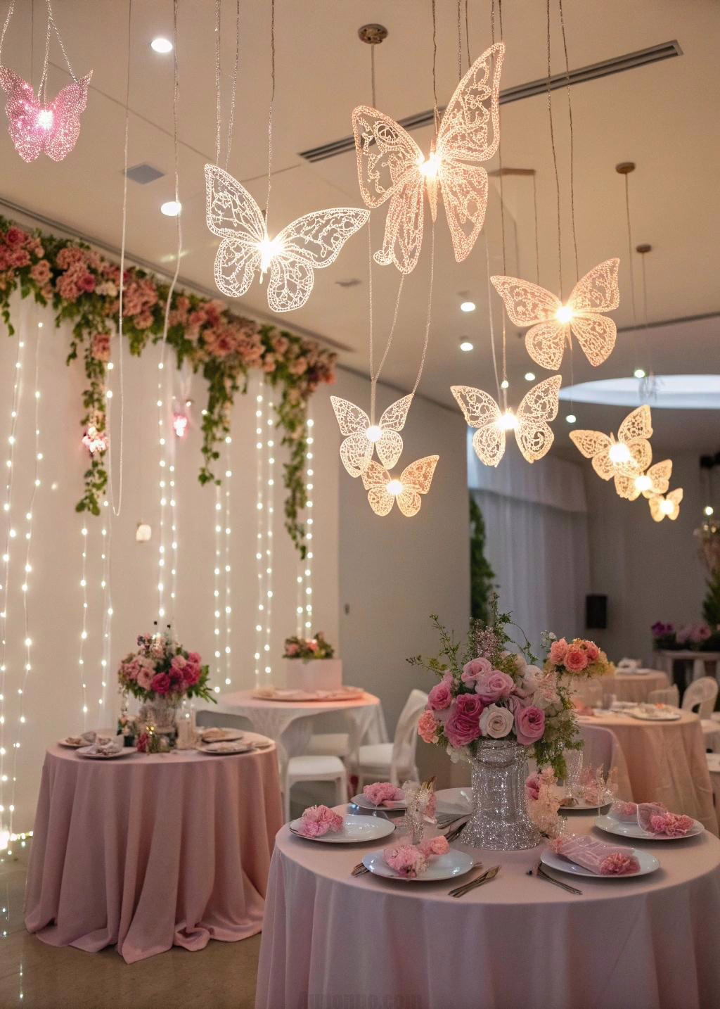 Use butterfly-shaped string lights to add a magical touch to your event space. Hang them above tables or around the room for a soft glow.