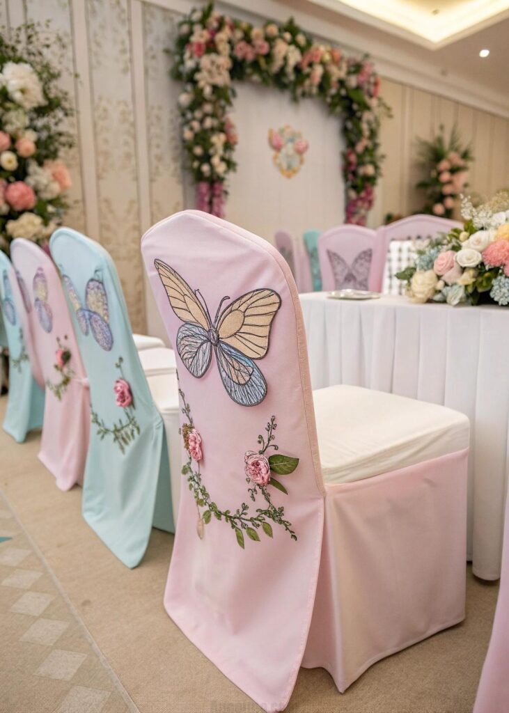 Dress up your chairs with butterfly-themed covers or sashes. Use pastel fabrics and attach butterfly cutouts or appliqués for a cohesive look.