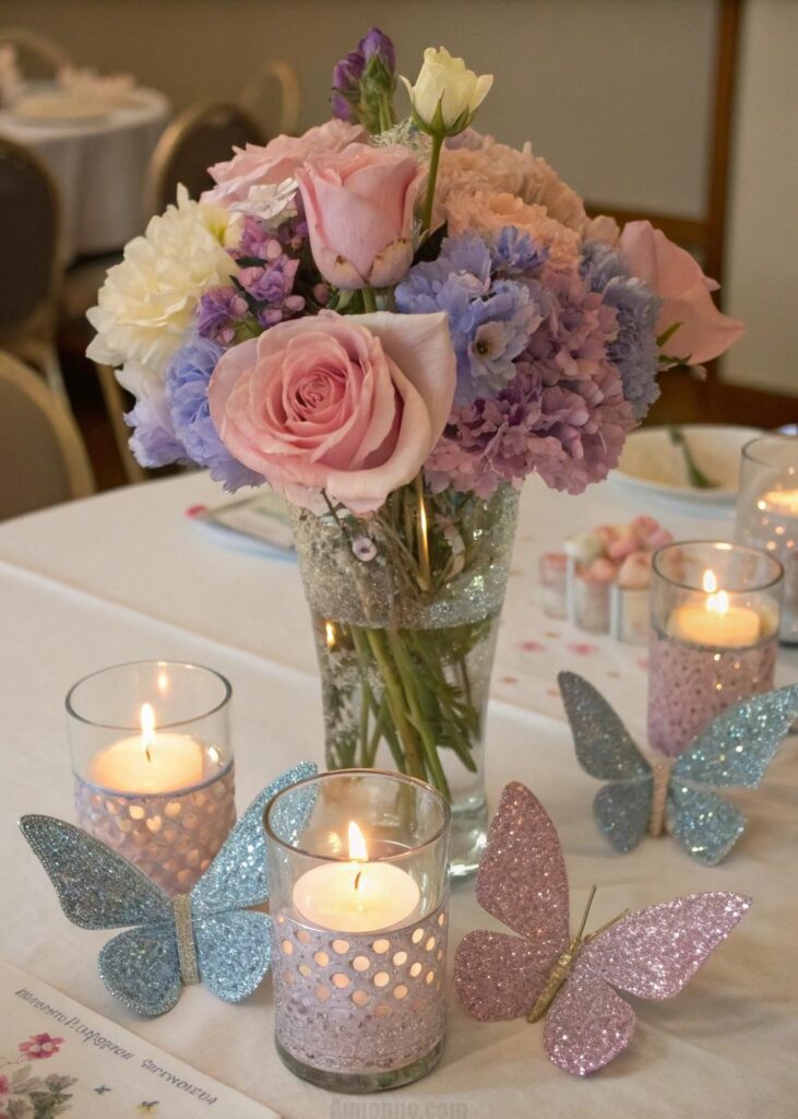Decorate tables with butterfly centerpieces to tie the theme together. Use glass vases filled with flowers and attach small butterfly cutouts to the stems. Add a touch of sparkle with glittery butterflies scattered around the base.