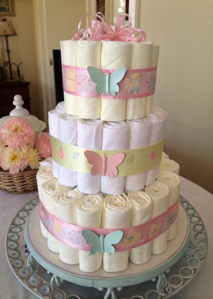Create a diaper cake decorated with butterfly accents. Use pastel-colored ribbons and attach small butterfly cutouts to the layers.