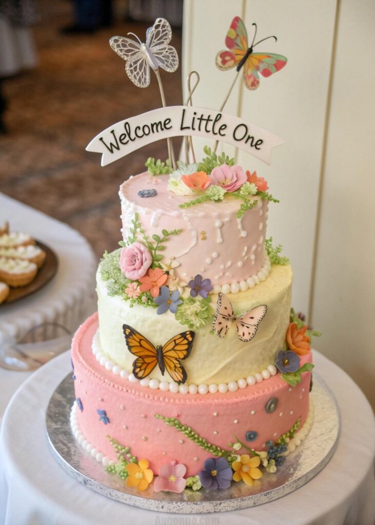 A two or three-tiered cake will make a grand statement. Don’t forget to add a cute cake topper like a baby butterfly or a “Welcome Little One” sign.