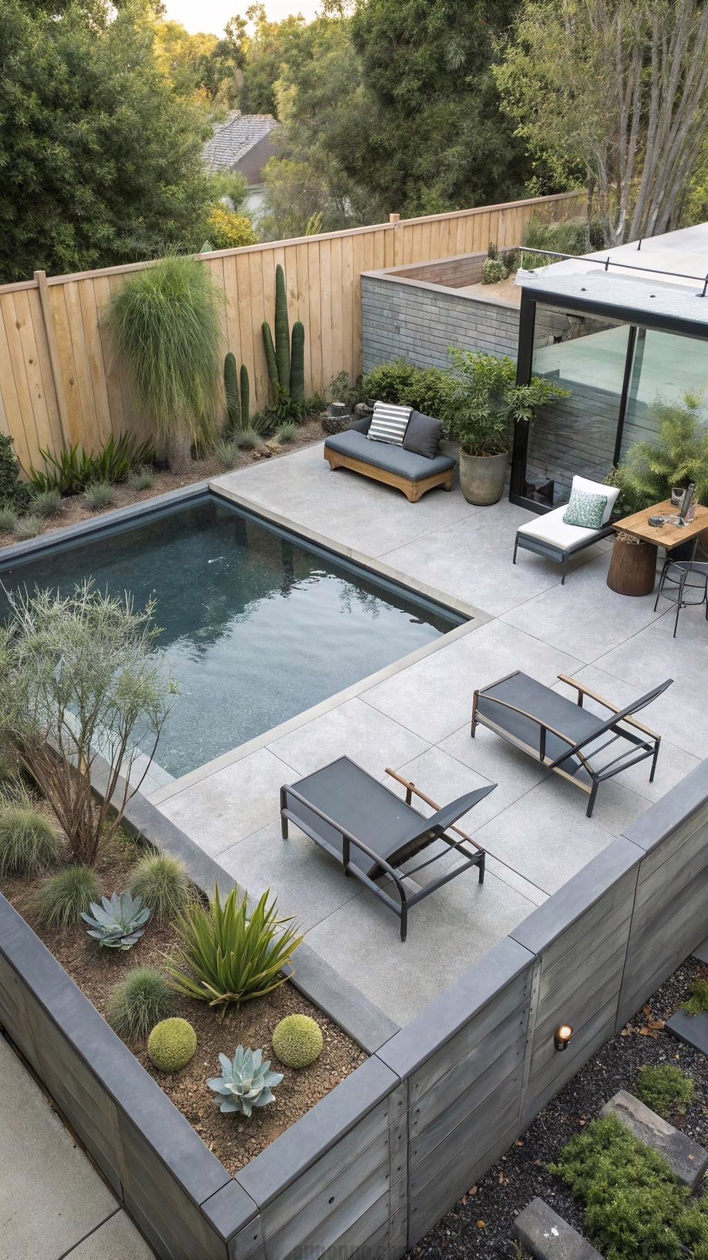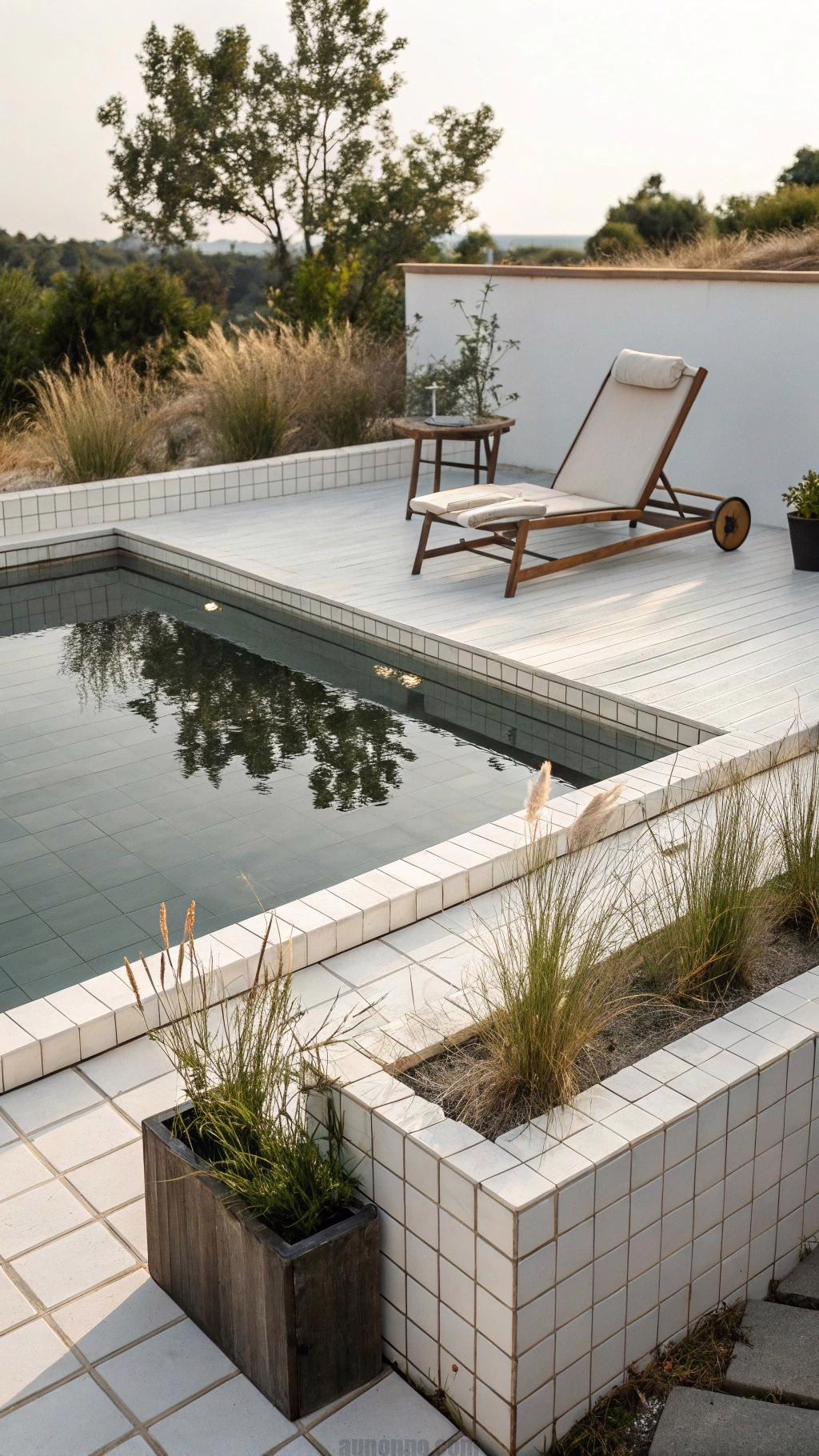 A minimalist reflecting pool deck uses sleek materials and simple lines to create a tranquil, spa-like atmosphere. Choose light-colored decking and minimal decor to keep the focus on the water’s surface. This design is perfect for meditation or quiet relaxation.
