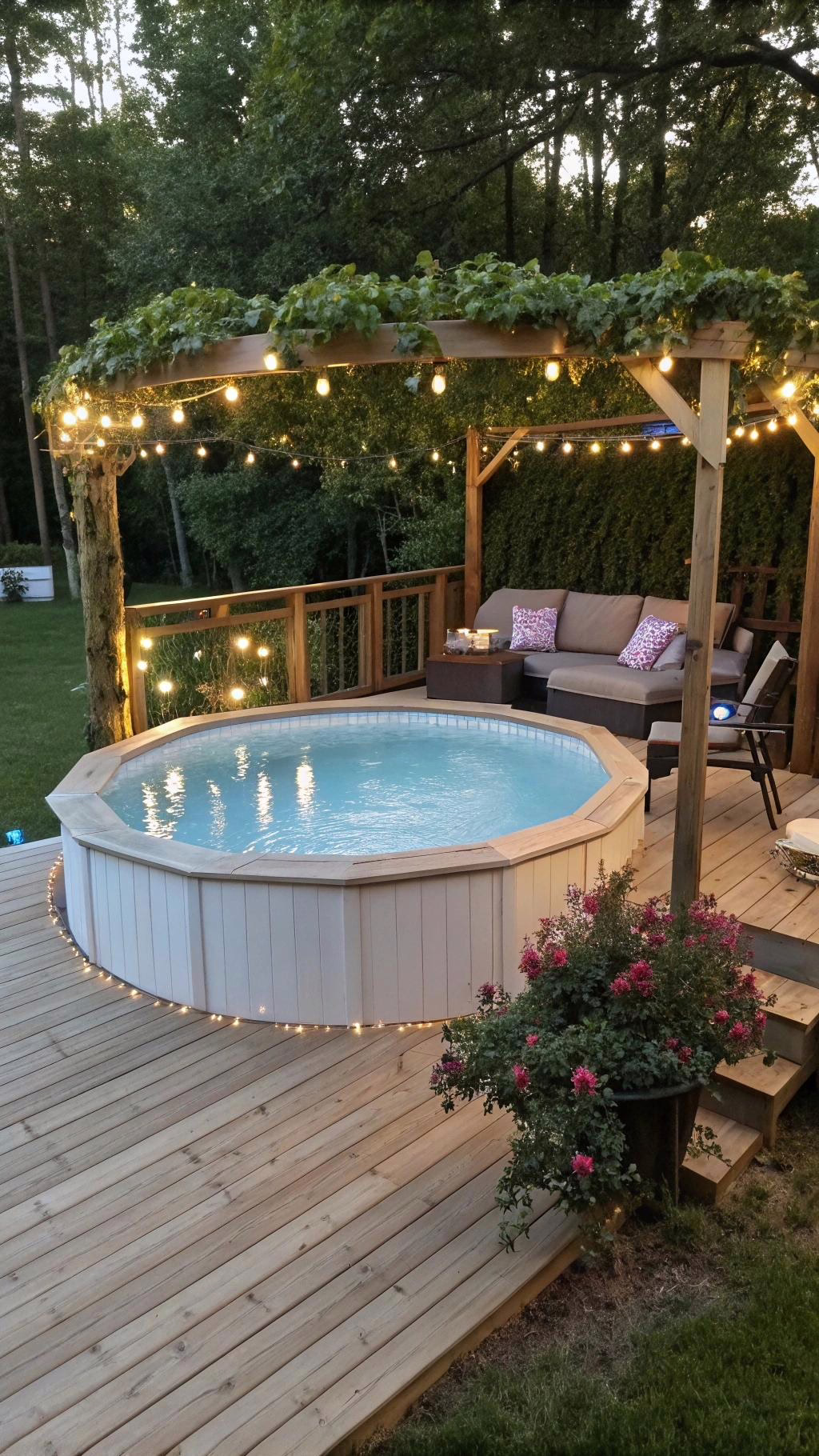 Adding a pergola to your above ground pool deck brings both shade and style, creating a cool retreat from the sun. The open structure allows for airflow while providing partial shade, making it an inviting spot for reading or relaxing. Pergolas also add vertical interest and can be adorned with climbing plants or string lights for extra ambiance.