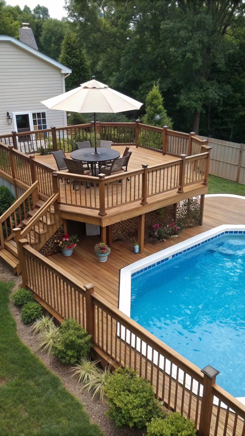 A multi-level deck adds architectural interest and functionality to your pool area by creating distinct zones for different activities. One level can be dedicated to sunbathing and another for dining or socializing, all connected by steps or ramps for easy flow. This design is perfect for families who want to maximize their outdoor living space and keep things organized.