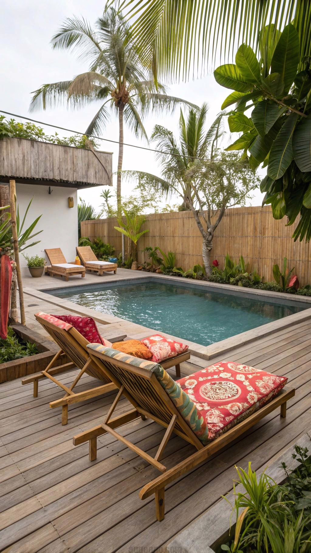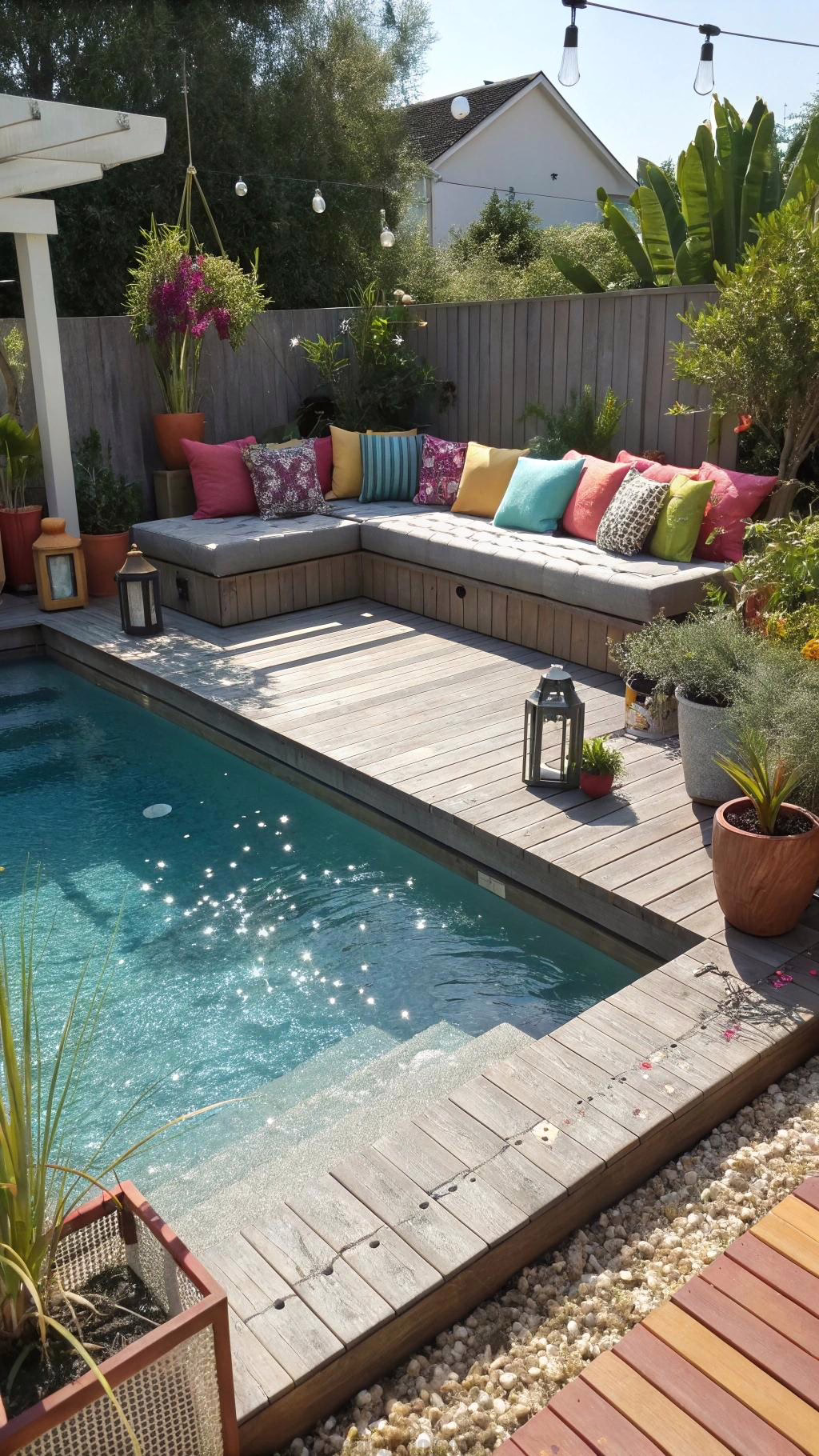 Transform your pool area into a tropical paradise with bamboo furniture, lush plants, and vibrant textiles. Surround the deck with palms, ferns, and colorful flowers to create a vacation-like escape right at home. Add bright cushions and umbrellas for a burst of color and comfort.