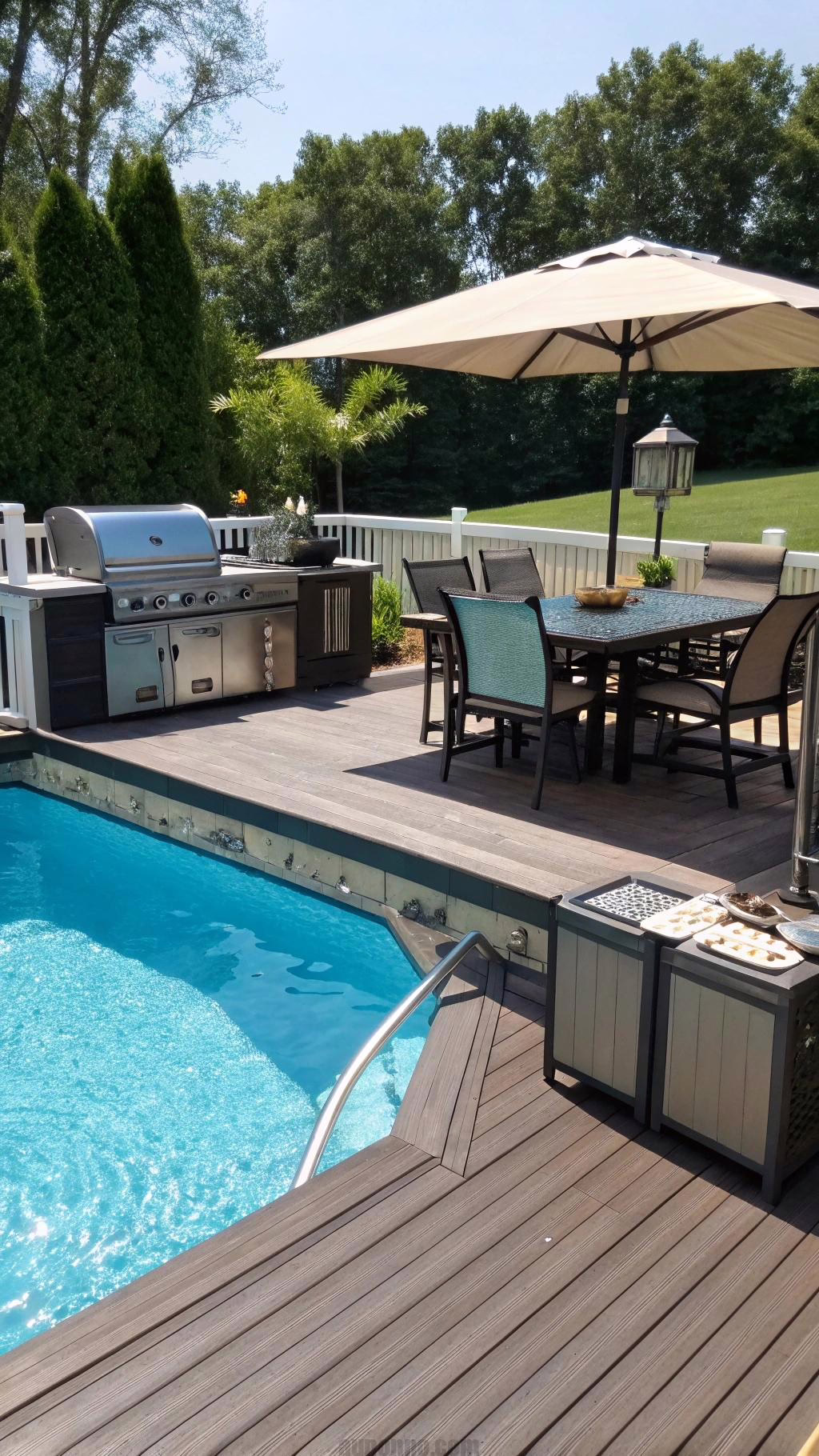 Upgrade your pool deck with a built-in outdoor kitchen for the ultimate entertaining space. Include a grill, mini fridge, and prep counter so you can cook and serve meals without leaving the pool area. This setup is ideal for hosting summer parties or family barbecues.