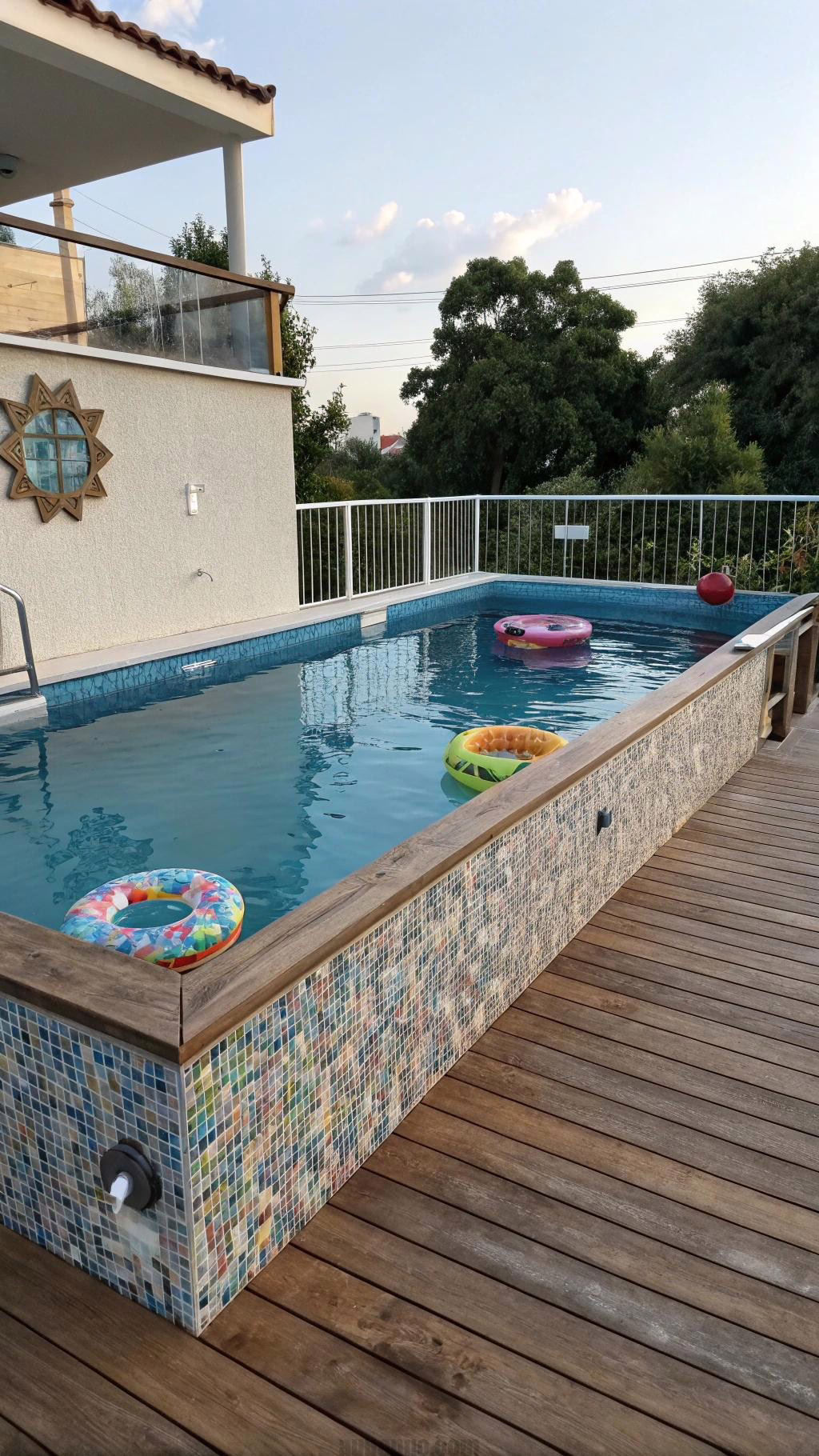 Decorate your deck or pool exterior with mosaic tiles for a sparkling, sunlit effect. Small tiles in vibrant colors or patterns can make your pool area feel like a resort, adding personality and charm. This idea works well with both wood and composite decks.