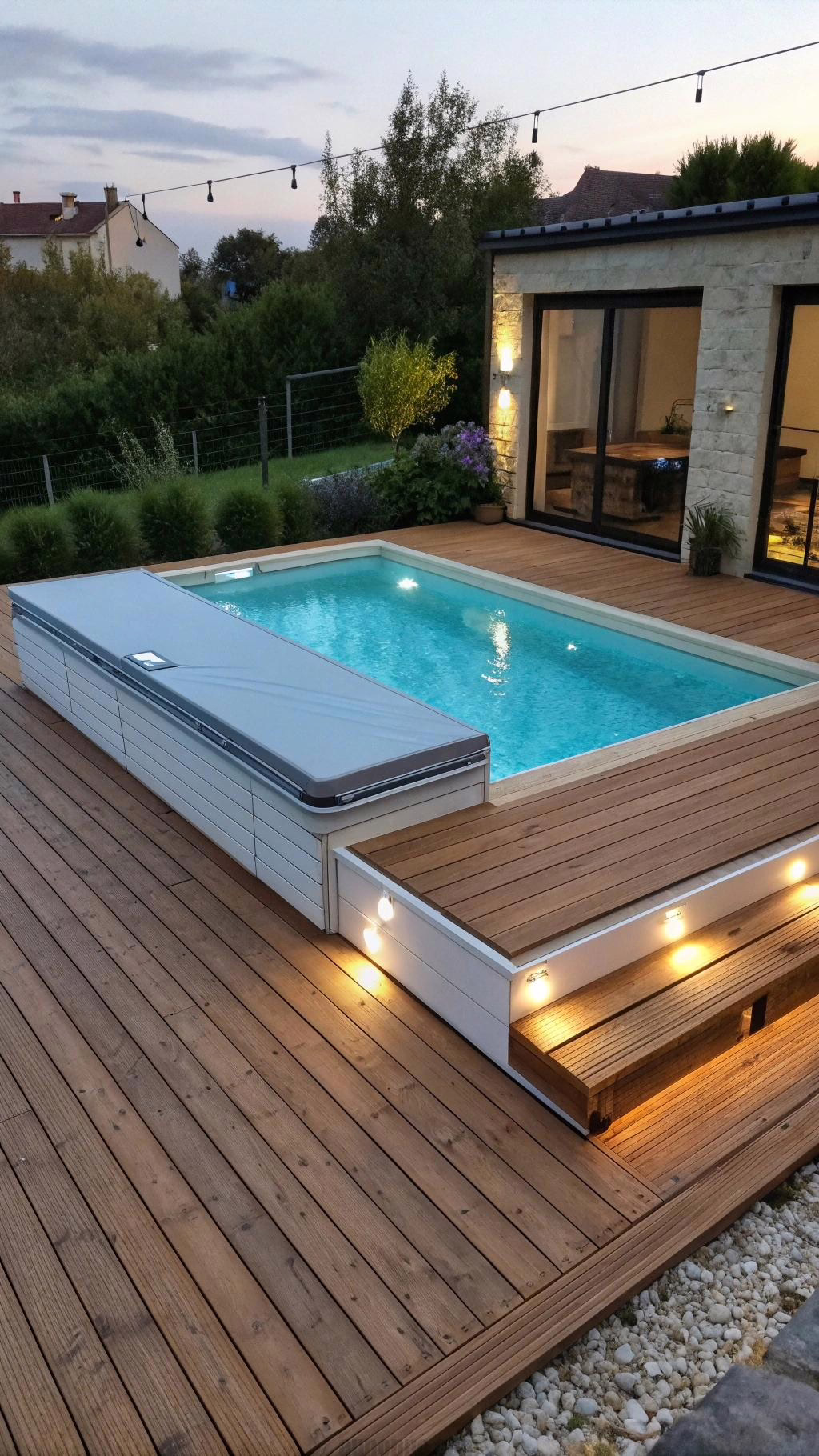 A floating deck appears to hover above the ground, giving your pool area a modern, sleek look. This low-profile design is perfect for contemporary homes and can be customized with lighting or minimalist furniture for extra flair. It’s a unique way to make your pool stand out while keeping maintenance simple.
