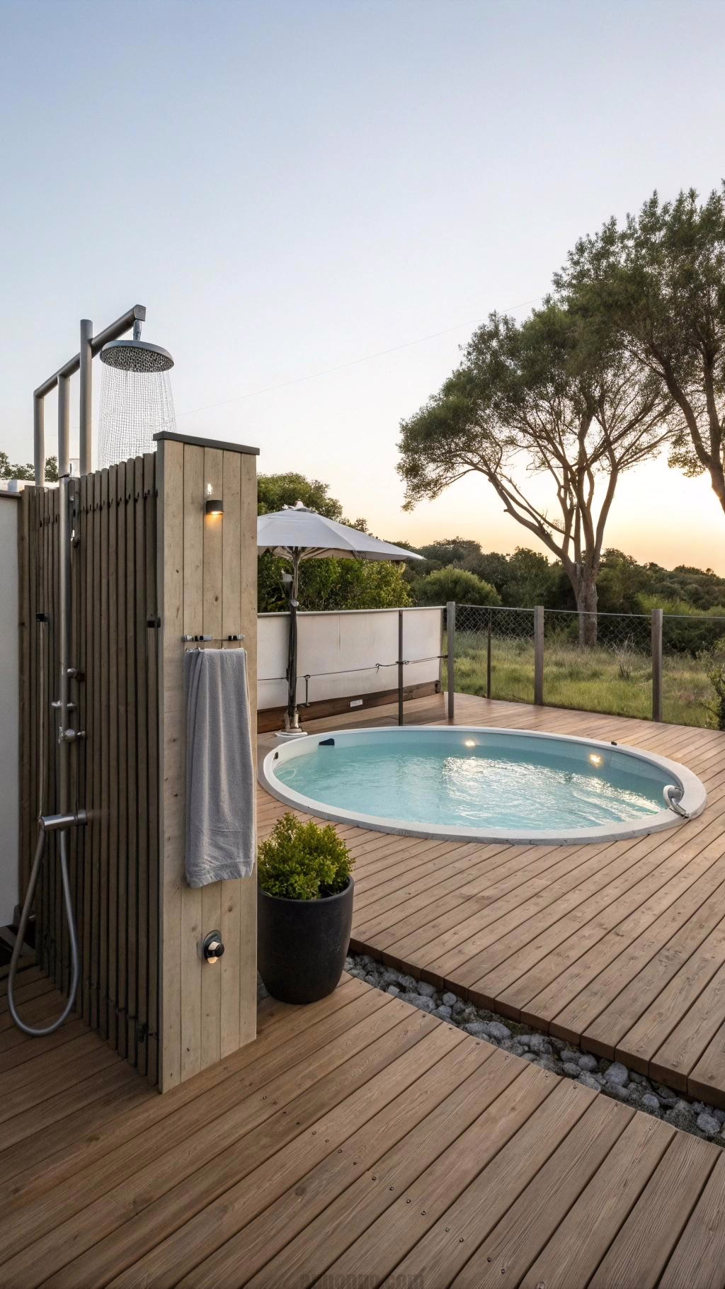 Install an outdoor shower on your pool deck for convenience and luxury. Rinse off before or after swimming, keeping your pool cleaner and making the experience feel like a high-end resort. Choose weather-resistant fixtures and add a privacy screen for comfort.
