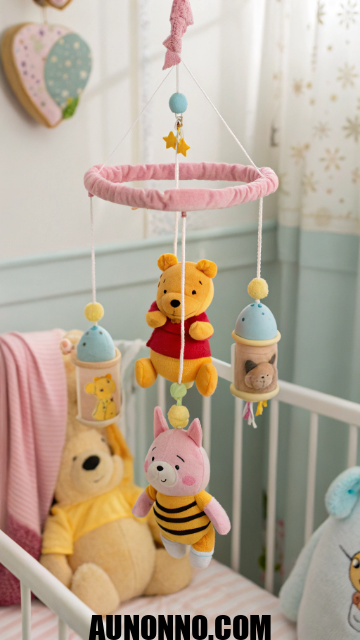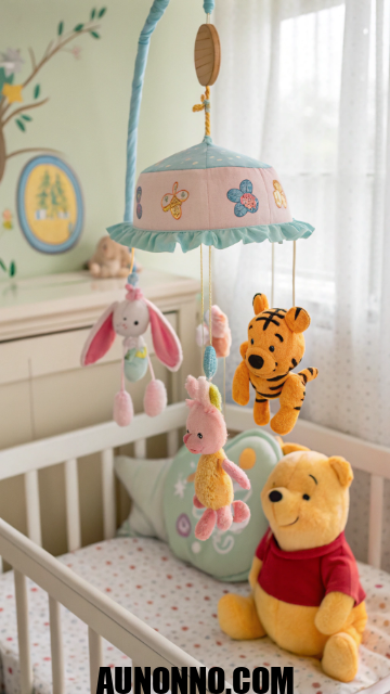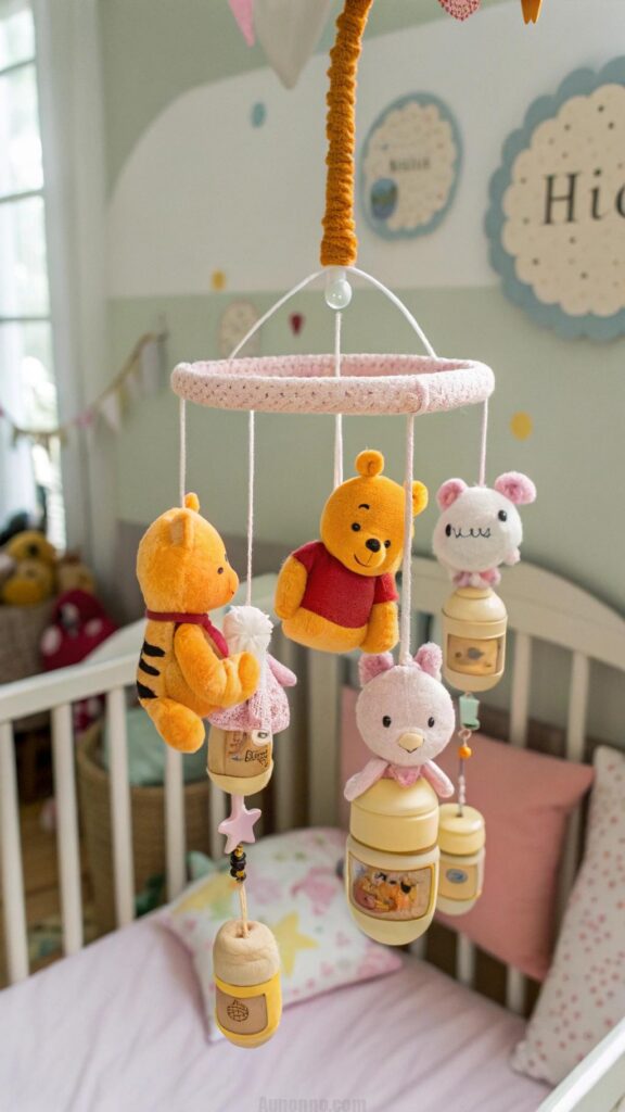 To add a touch of whimsy, consider a mobile that features hanging characters or honey pots. This not only adds visual interest but also entertains your baby as they gaze up at the colorful figures.