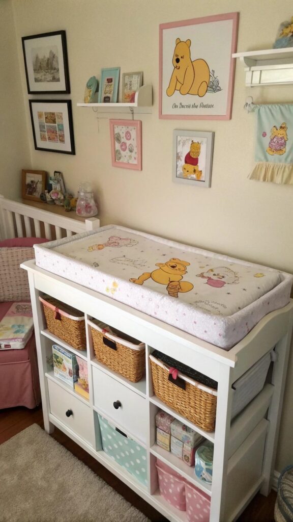 Look for changing tables that feature soft colors or Pooh-themed designs. You can also add a changing pad cover adorned with Pooh and friends to make the space more inviting.