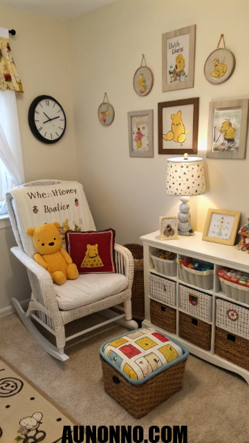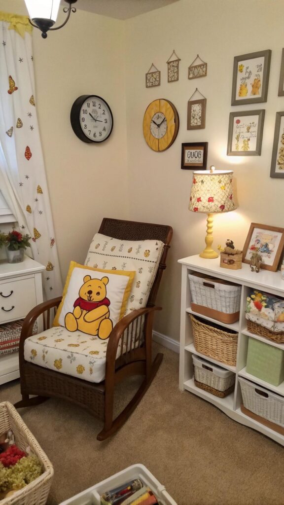 Accessories play a crucial role in completing your Winnie the Pooh nursery ideas. Consider adding decorative pillows with Pooh-themed designs to the rocking chair or glider. These not only provide comfort but also enhance the overall aesthetic of the room.