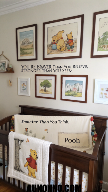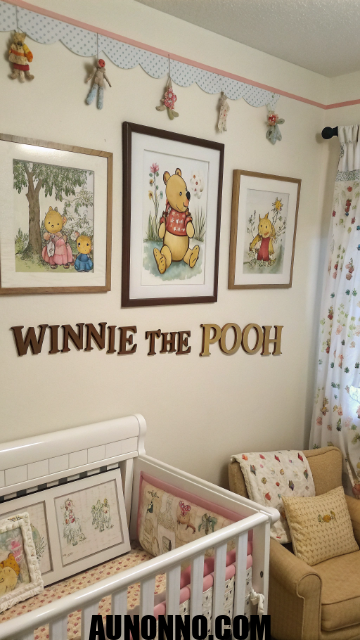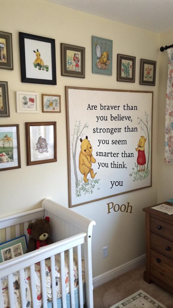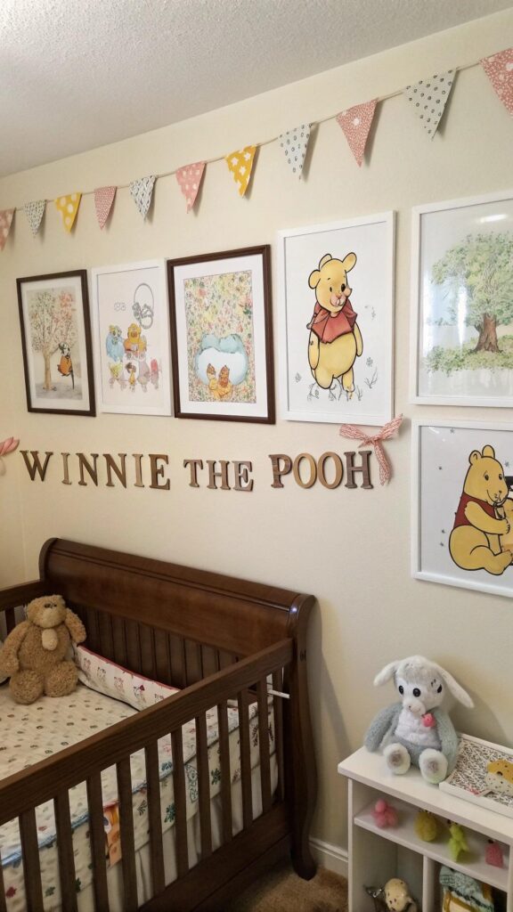 Wall art is a fantastic way to bring your Winnie the Pooh nursery ideas to life. Consider creating a gallery wall with framed prints of classic illustrations from A.A. Milne’s stories. You can mix and match different sizes and styles of frames for an eclectic look.