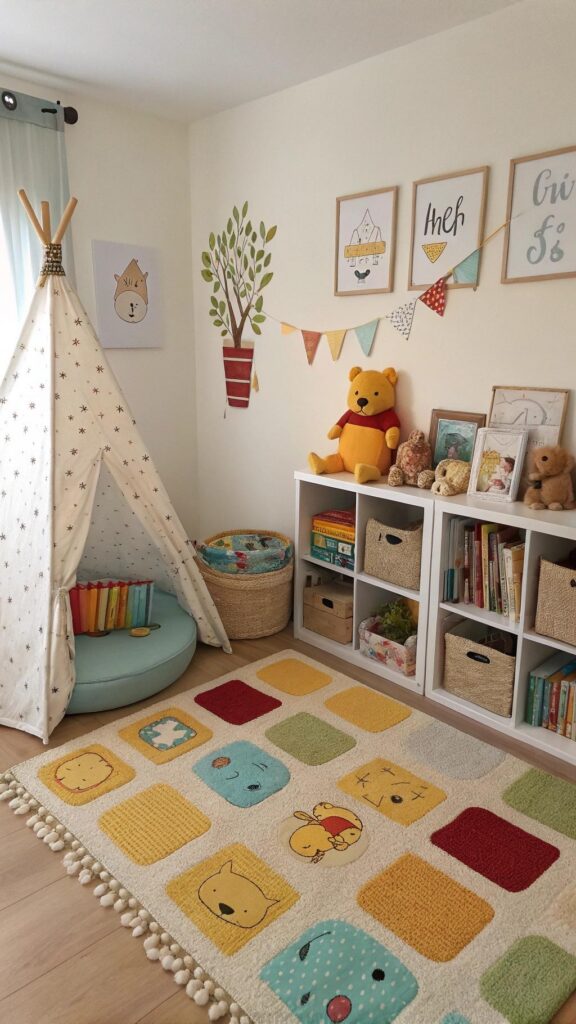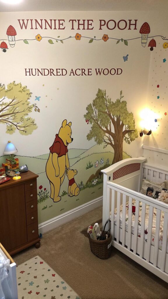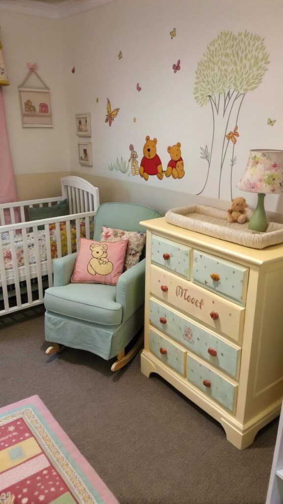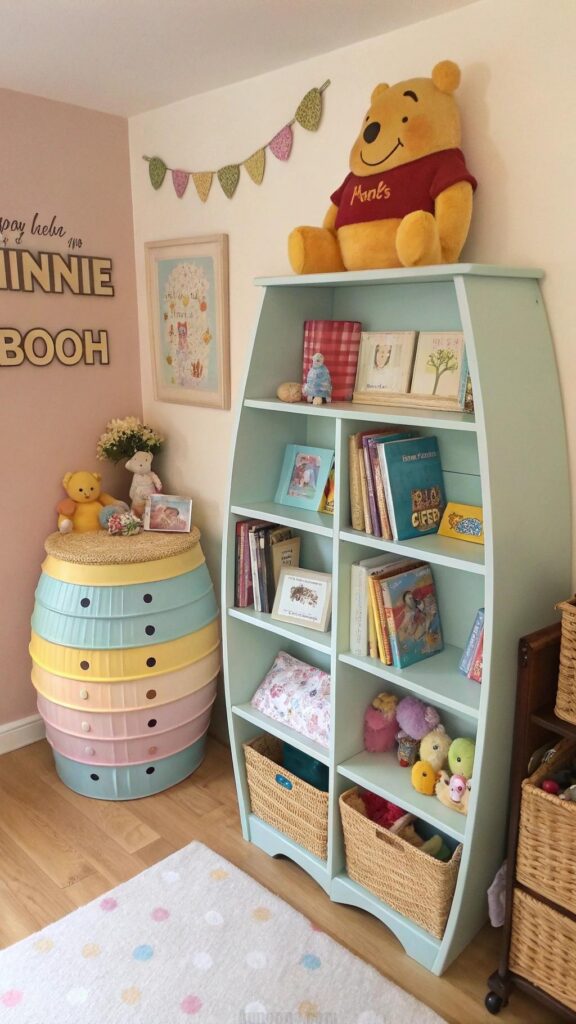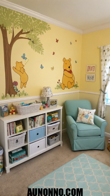 You can also incorporate themed storage solutions, such as baskets or bins featuring Pooh and friends, to keep toys and essentials organized.