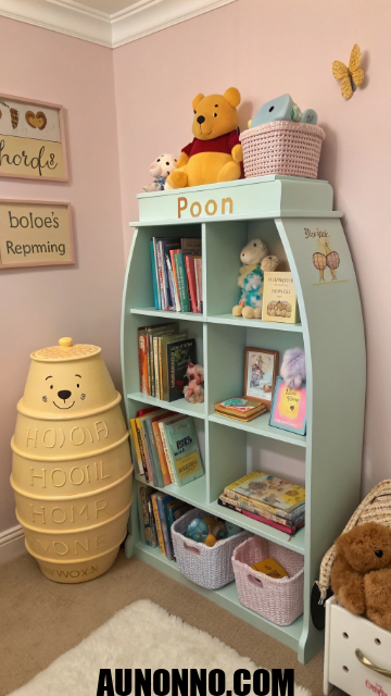 Incorporating a bookshelf into your nursery design is a practical and charming idea. Choose a bookshelf that complements your Winnie the Pooh theme, perhaps painted in soft pastel colors or shaped like a honey pot.