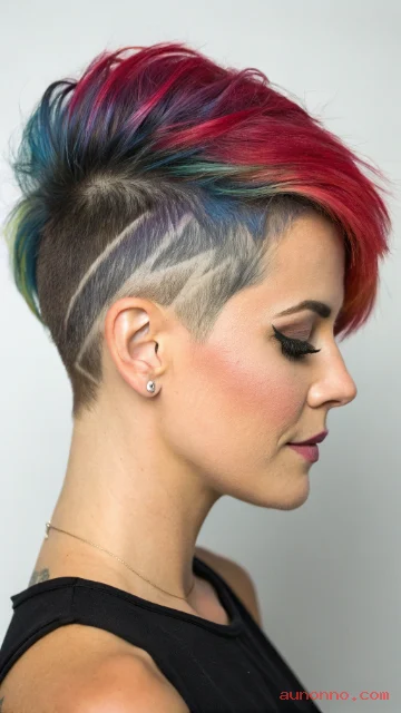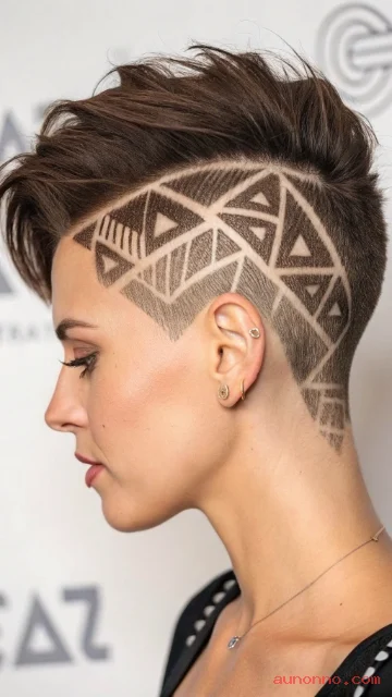 Design options range from simple geometric lines to intricate patterns or even images. The designs add permanent art to your hair that makes the asymmetrical cut feel uniquely personal. This approach appeals to people who view their hair as a creative canvas.