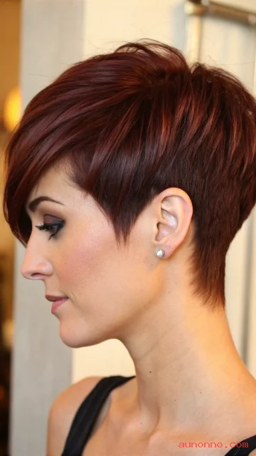 This rich color choice appeals to people wanting to express creativity through color without going neon or pastel. Burgundy pixies read as fashion-forward while maintaining sophistication. The color complements the geometric structure of asymmetrical cuts beautifully.