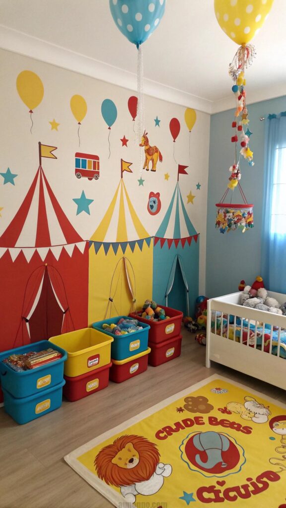 Incorporate circus-themed bedding and plush toys to enhance the decor. A mobile featuring circus tents and balloons can add a whimsical touch. Consider using storage solutions like colorful bins to keep toys organized while adding to the playful vibe.