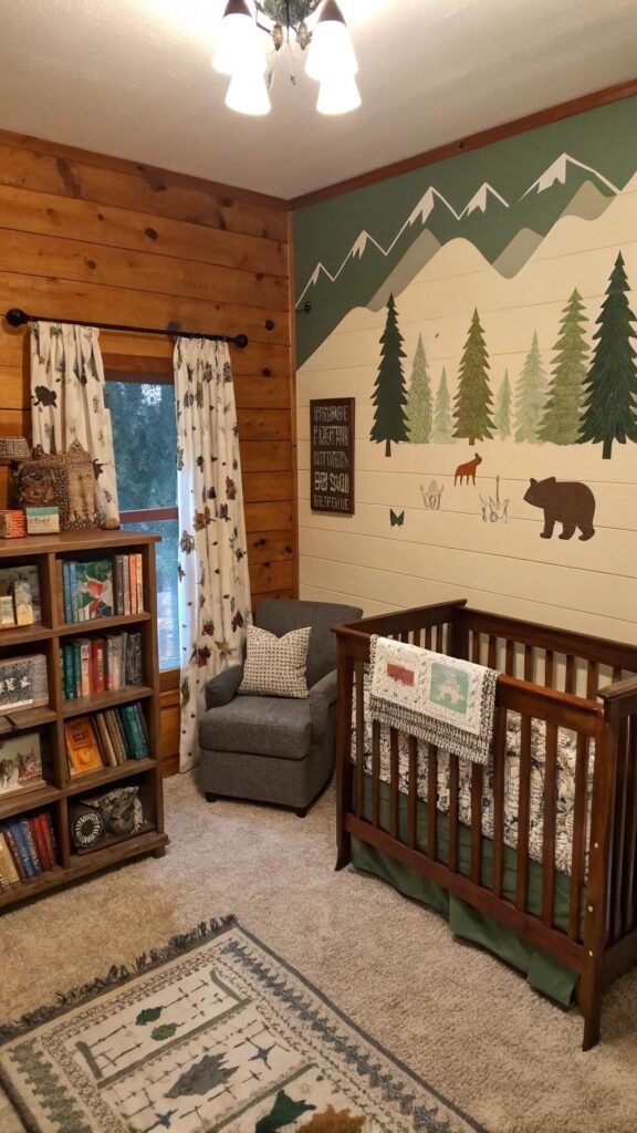 Incorporate rustic elements like wooden furniture and plaid patterns in bedding and curtains. A plush rug resembling a bear or a cozy throw can add warmth to the space. Consider adding a bookshelf with nature-themed books to inspire a love for the great outdoors.