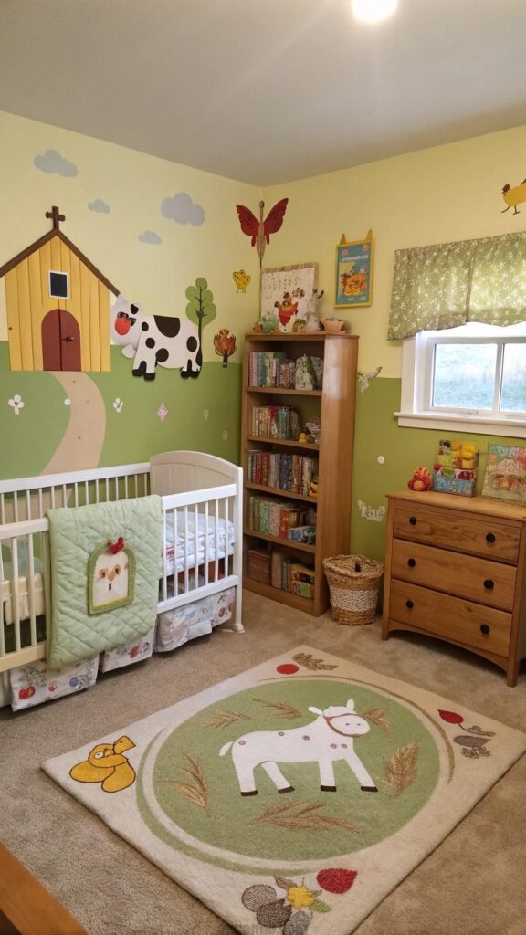 Incorporate rustic elements like wooden furniture and a barn-themed mobile to enhance the farmyard feel. A plush rug shaped like a barn can provide a fun play area for your baby. Consider adding a bookshelf with farm-themed books to encourage early literacy and a love for animals.
