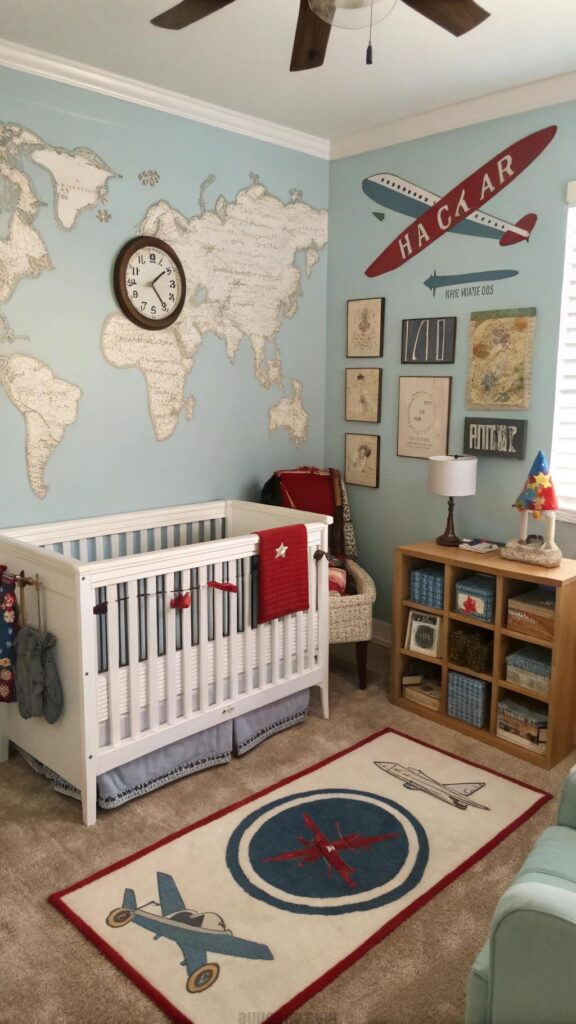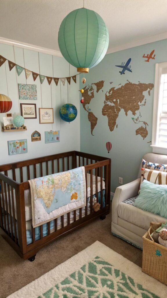 Incorporate travel-inspired accessories, such as a mobile featuring airplanes and hot air balloons. Choose bedding with world map prints and plush toys representing different countries. A cozy reading nook with travel-themed books can encourage a love for exploration and learning.
