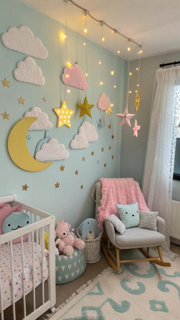 Incorporate bedding with cloud patterns and plush toys shaped like clouds and stars. A cozy rocking chair can provide a comfortable spot for nighttime feedings and cuddles. Consider using soft lighting, such as fairy lights, to enhance the dreamy ambiance.