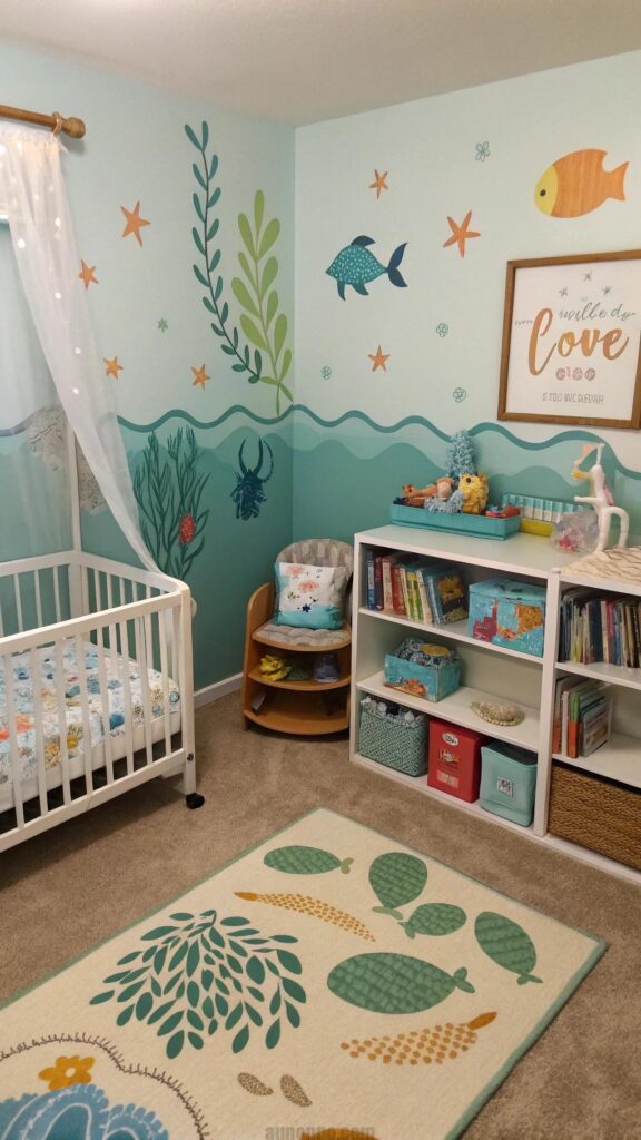 An under-the-sea nursery is a whimsical choice for parents who love ocean life. Use a color palette of soft blues, greens, and sandy beiges to create a calming atmosphere. Decorate the walls with ocean-themed decals, such as fish, turtles, and coral, to bring the underwater world to life.