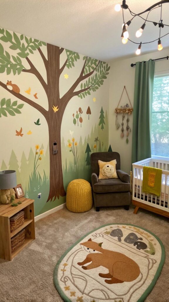 Bring the beauty of nature indoors with a woodland adventure nursery. Use earthy tones like greens, browns, and soft yellows to create a calming atmosphere. Decorate the walls with forest animal decals, such as foxes, bears, and deer, to create a whimsical feel. A tree mural can serve as a stunning focal point, making the room feel like a cozy forest retreat.