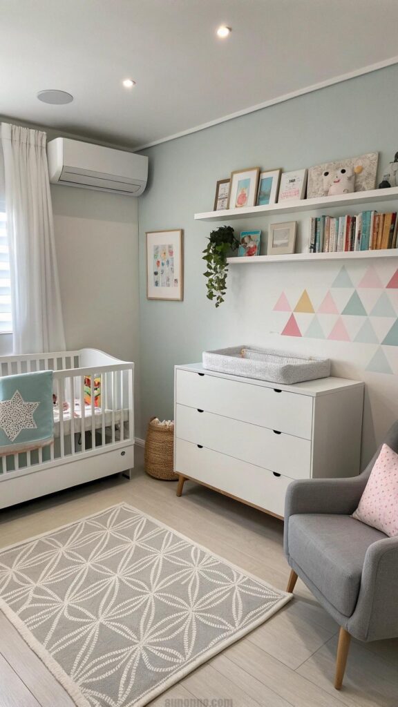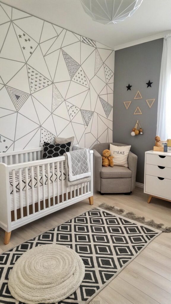 Incorporate furniture with clean lines and geometric shapes to enhance the modern aesthetic. Choose bedding with geometric patterns and plush toys that complement the design. A cozy rug with geometric designs can add warmth and comfort to the space.