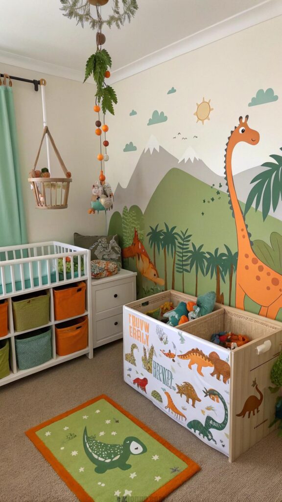 Choose bedding with fun dinosaur prints and plush toys to enhance the theme. A mobile featuring hanging dinosaurs can add a playful touch. Consider using storage solutions like dinosaur-shaped bins to keep toys organized while adding to the decor.