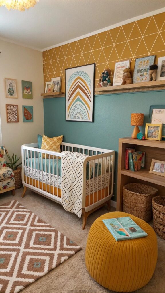 Incorporate mid-century modern furniture and accessories to enhance the retro vibe. Choose bedding with geometric patterns and plush toys that reflect the era. A cozy reading nook with vintage children’s books can add to the charm and provide a space for bonding and storytelling.