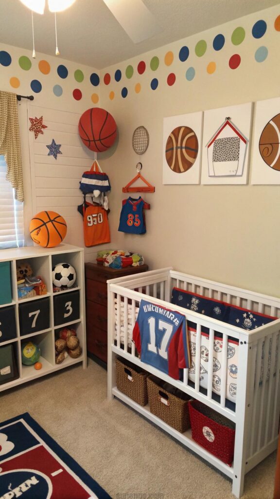 Incorporate bedding featuring sports motifs and plush toys shaped like sports equipment. A mobile with hanging sports balls can add a playful touch. Consider using storage solutions like bins with sports designs to keep toys organized while enhancing the decor.