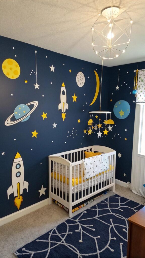 For parents who dream of their little one reaching for the stars, a space explorer nursery is a fantastic choice. Use deep blues and blacks as the base colors, accented with bright whites and yellows to represent stars and planets. Wall decals of rockets, astronauts, and celestial bodies can create an out-of-this-world atmosphere.