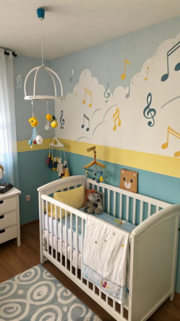 Incorporate musical-themed bedding and plush toys shaped like instruments. A mobile featuring musical notes and instruments can add a playful touch. Consider using a sound machine that plays soothing melodies to help your baby relax and sleep.