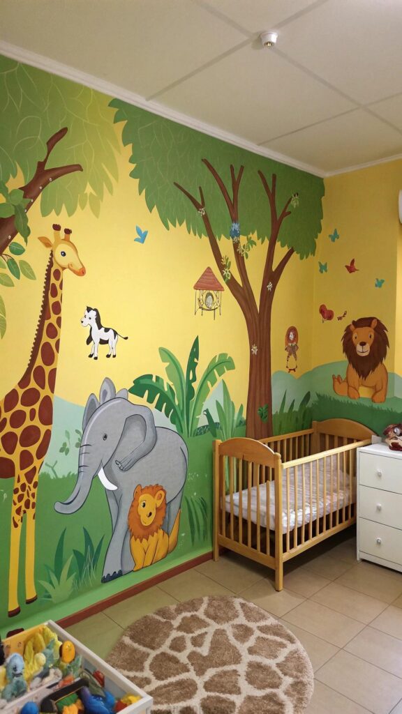 Transform your nursery into a safari adventure with vibrant colors and exotic animal prints. Use a palette of greens, yellows, and browns to create a lively atmosphere. Wall decals of lions, elephants, and giraffes can bring the safari theme to life, while a jungle mural can serve as a stunning backdrop.