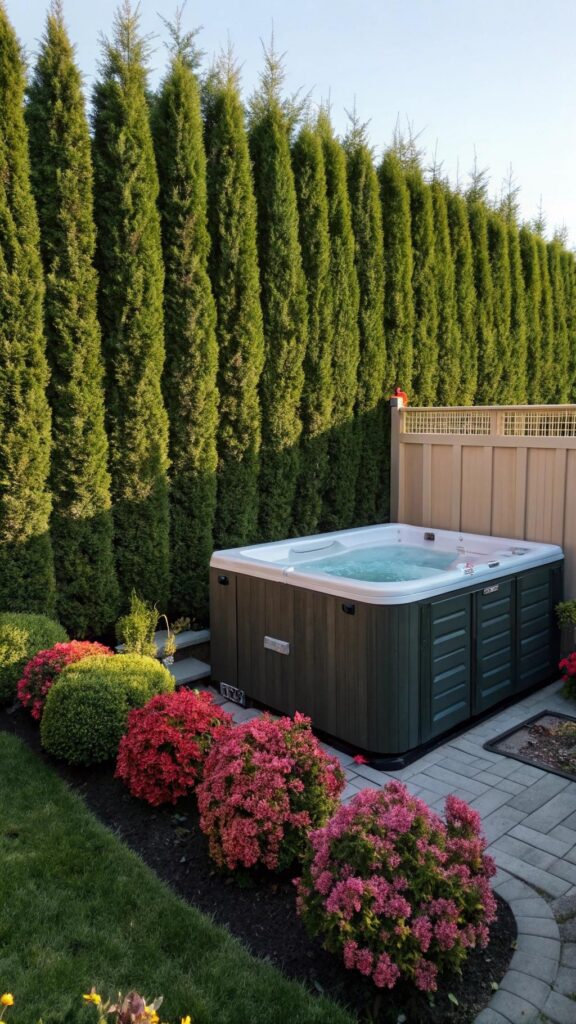 Planting a dense hedge around your hot tub provides natural screening. It creates a secluded and private space for relaxation.