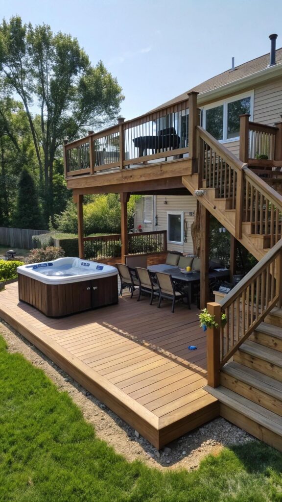 Place the hot tub on a lower level for privacy or elevate it for views. Use steps or ramps to connect the different deck levels.