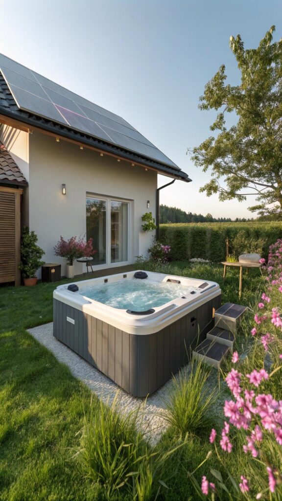 Consider a solar-powered hot tub for an environmentally conscious choice. It uses the sun’s energy to heat the water.