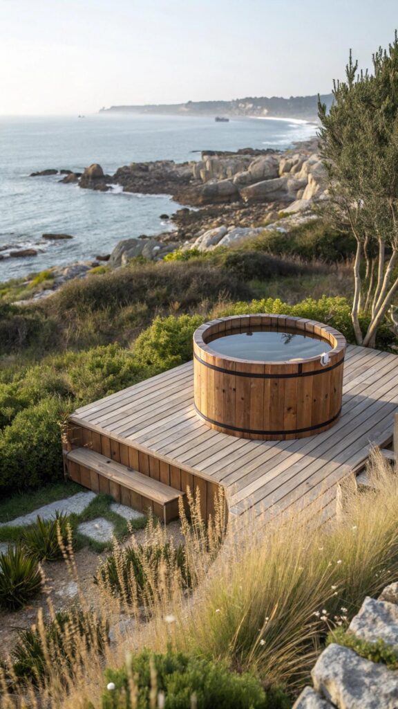 Place the tub on an elevated deck or patio edge overlooking a lake, mountains, or garden. Ensure the seating direction maximizes the vista.