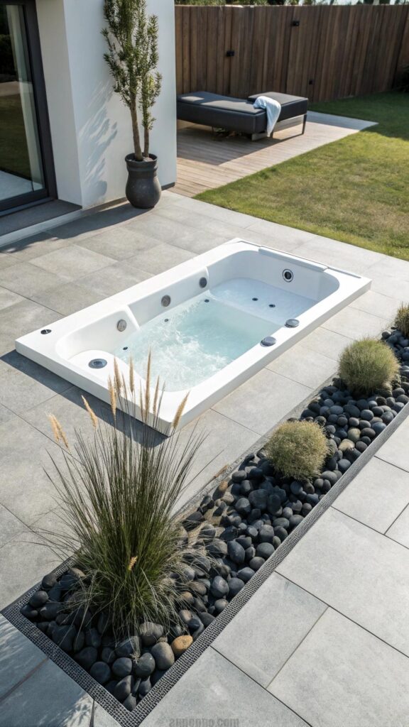 Mimic the square shape of your hot tub with nearby elements. Square planters or pavers create a cohesive design.