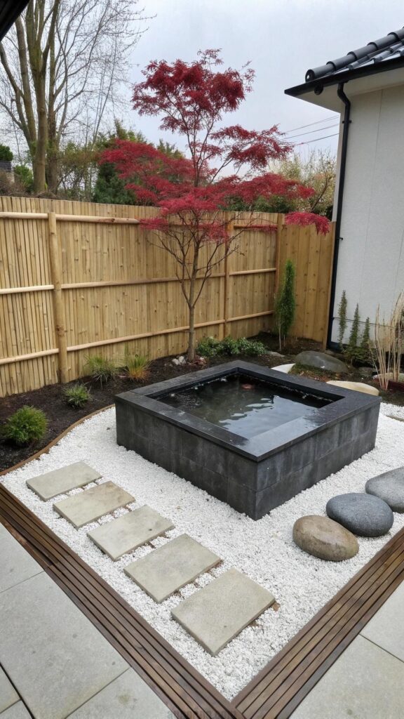 Incorporate smooth stones, gravel paths, and perhaps a small bamboo water fountain. Use natural wood for decking or surrounds to enhance the calm atmosphere.