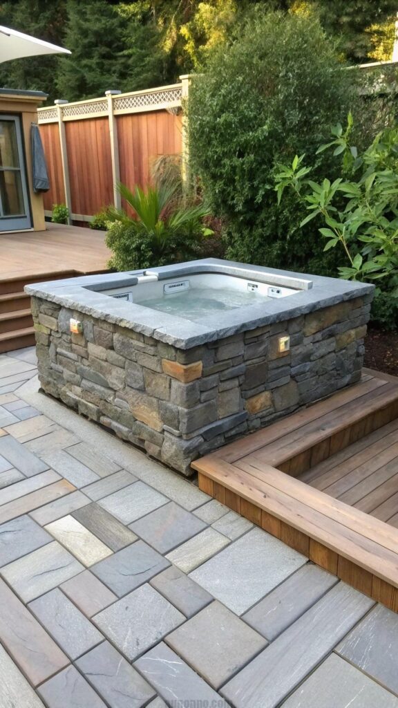 Covering the exterior of your hot tub with natural materials creates a sophisticated look. Stone or wood cladding helps the tub blend with outdoor elements.