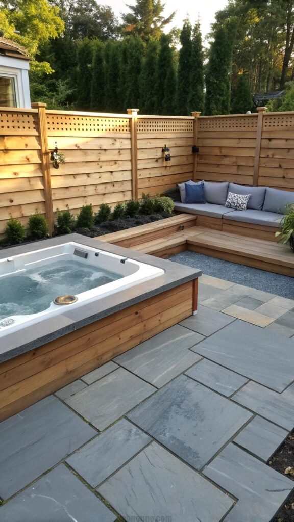 Use materials like stone pavers or concrete for pathways and patios. These elements complement the hot tub and provide seating areas.