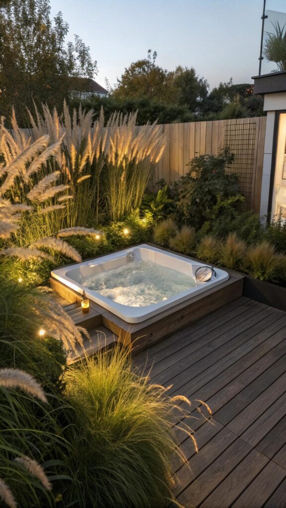 Connect the hot tub area using pathways or consistent planting schemes. This links the spa zone visually to the rest of the landscape.